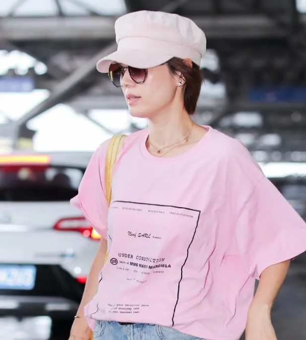 马伊琍的这件粉色T恤,款式宽宽大大的,浅浅的颜色也不会太过亮眼,上面添加黑色的线条作为装饰,简单的造型反而起到减龄的效果,同时又很和谐自然。