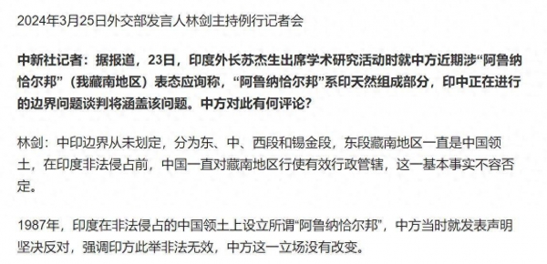 近日,印度外长苏杰生公然质疑中国对藏南地区的领土政权,宣称这里是"印度的天然组成部分",还声称目前中印两国的边界谈判将"涵盖藏南问题"。这一不负责任的表态立即引发了中国强烈反应。据央视3月26日报道,当地时间25日,外交部发言人林剑表示,藏南地区是被印度"非法侵占"的,中方坚决反对苏杰生的表态。