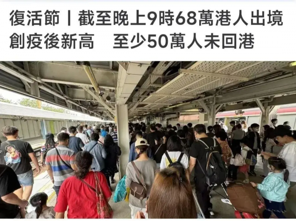 香港入境处数据显示,截至4月1日晚上9时,5天假期里,有超过227万人次香港居民出境,入境旅客49.8万人次,当中超过190万港人前往内地,即出境港人中有逾83%北上。