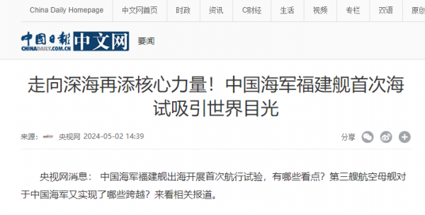 中国日报--2024-05-02--《走向深海再添核心力量!中国海军福建舰首次海试吸引世界目光》