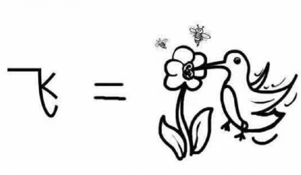 这个汉字很简单,整体来看就3画,也就是说3笔就能完成这个字,这就是飞翔的"飞"字,但是在外国人眼里却变成了一只鸟在啄一朵花,看上去鸟的翅膀特别像一个"飞"字,但是敢问这朵花哪来的呢?而且仔细看,花的上面还有两只蜜蜂。