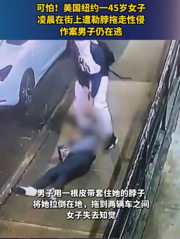 美国纽约,凌晨3时许,一名45岁女子在街头遭一非裔男子绑走强奸。男子疑似用皮带勒住女子脖子拖走。男子将其拉到两车之间实施性侵。该男子仍在逃,警方称两人或相识,并呼吁民众提供更多线索。大约在凌晨3点钟,布朗克斯区东152街与第3大道交汇地带,一名45岁的女性在街头遭遇不幸。当时,她正独自步行,不料一名男子从其背后悄悄靠近。