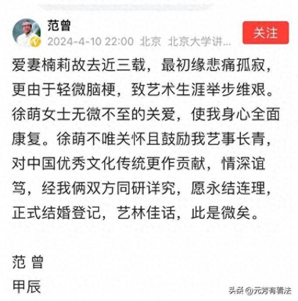 4月10日晚10时,范曾很隆重地宣布了这个大喜事,从范曾寥寥数语中可以感觉到溢出的甜蜜和幸福。范曾说在妻子楠莉去世后,自己悲痛孤寂,一度让自己的艺术之路无法继续下去,幸亏有了徐萌女士无微不至的关怀,才让他的身心重新焕发了光彩。