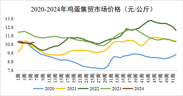 2024年2月第2周全国鸡蛋平均价格11.02元/公斤,环比上涨0.5%,同比下跌6.5%。河北、辽宁等10个主产省份鸡蛋价格9.67元/公斤,环比上涨0.6%,同比下跌7.6%。