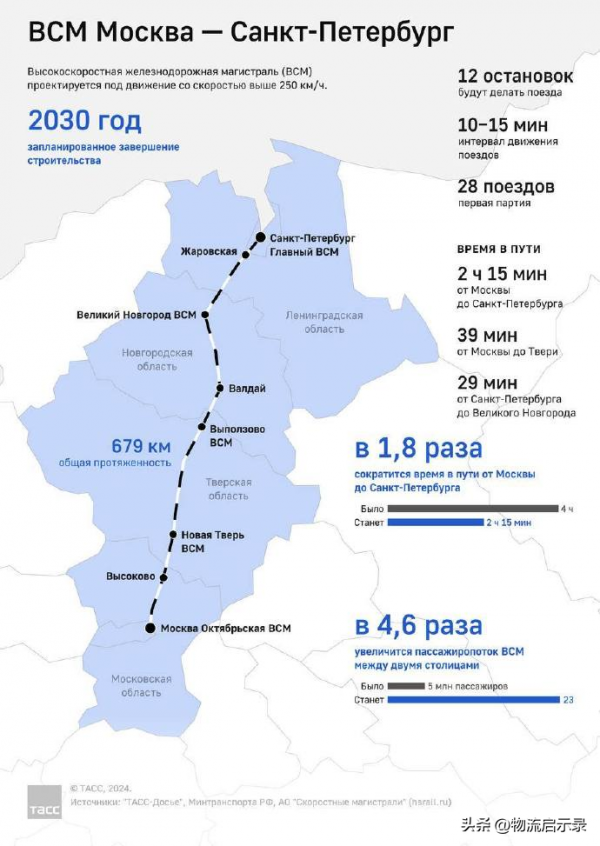 据悉,"莫斯科-圣彼得堡"高铁全长679公里,设计最高时速400公里,运行时速360公里。项目计划总投资2.1245万亿卢布(约235亿美元),其中建设投资1.9765万亿卢布(约215亿美元),采购高铁列车1480亿卢布(约20亿美元)。项目分两期,一期计划2028年建成通车,全线计划2030年建成通车,届时莫斯科与圣彼得堡间的火车运行时间将缩短至2小时15分钟。