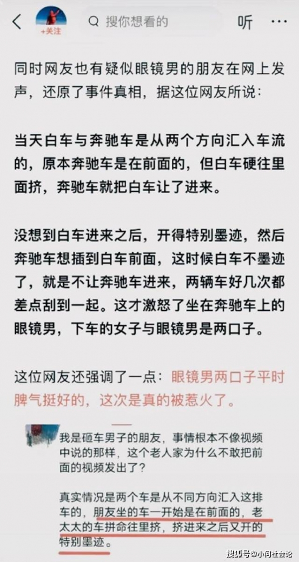 当然网上也有传闻是奔驰车原本在前,是老太太拼命往里面挤,挤进来后又开得很慢,所以才惹怒了男子。