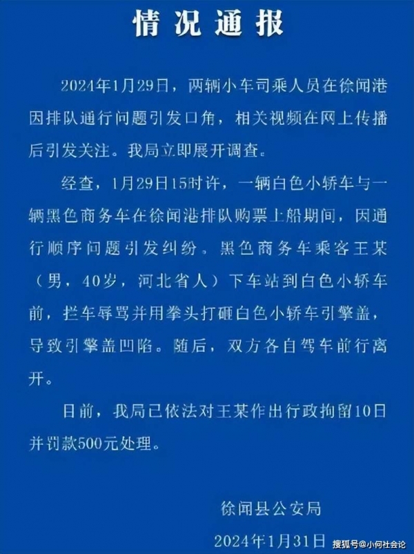 1月31日,徐闻县警方发布对这件事的处理结果,通报中称男子因拦车辱骂打砸他人车辆,已被警方依法行拘10日并罚款500元。