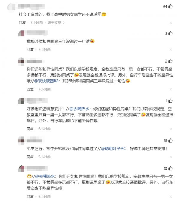 还有一些网友,开始回忆自己的校园时光,纷纷表示上学时男女有别,男同学和女同学之间都不怎么说话的,更有甚者,都不能和异性同桌。看来,你们应该是70、80后吧?
