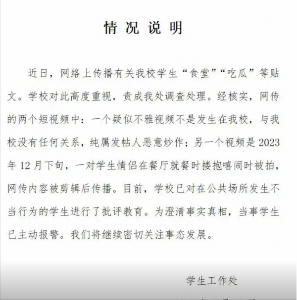 毕竟事关学校声誉,校方也是十分重视,在视频发布当天,校方就及时对此事进行了调查处理,并于当天紧急发布了情况说明,又于次日发布了一份声明。情况说明和声明两份文件要表达的意思都大差不差:网上传播的两个短视频中,一个视频场景不是该校场景,纯属发帖人恶意炒作,视频内容为两个视频拼接剪辑而成。