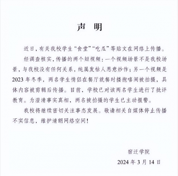 校方也在声明中提到,两名被拍摄的学生已主动报警,校方还表示将继续关注事态发展。