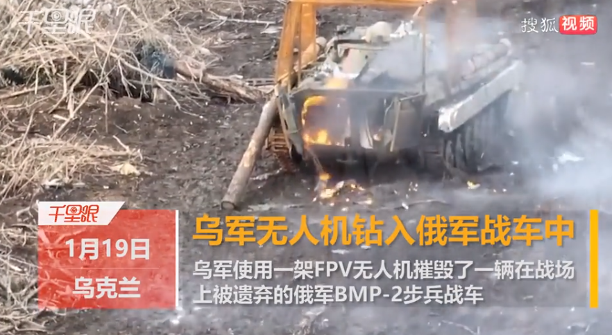 1月19日,乌克兰,乌军使用一架FPV无人机摧毁了一辆在战场上被遗车的俄军BMP- 2步兵战车。