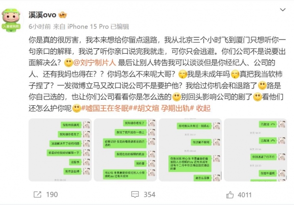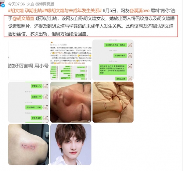 6月5日,一位自称是胡文煊女友的网友控诉胡文煊孕期出轨、恋爱期间多次出轨、丢粉丝信,还提到胡文煊与学舞蹈的未成年人发生关系。