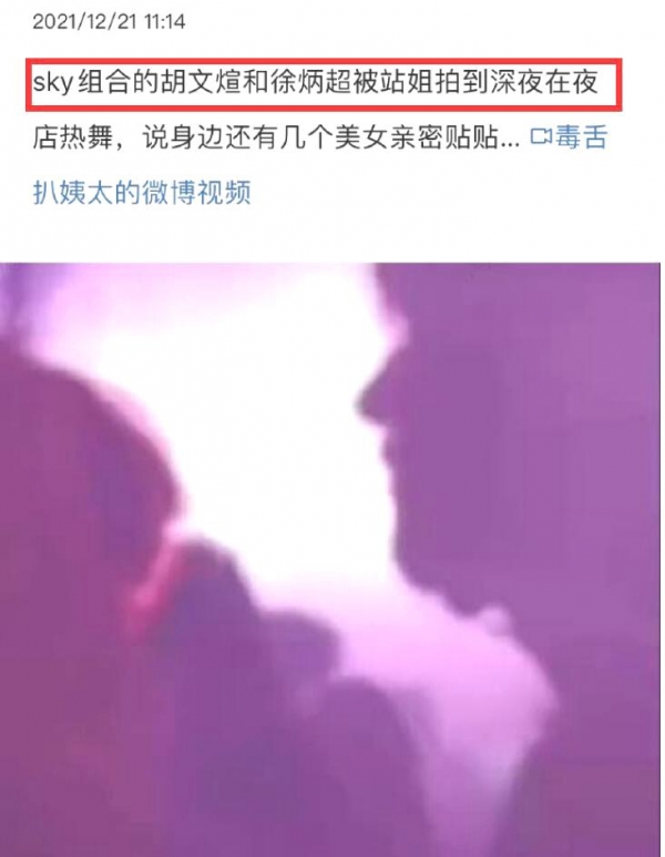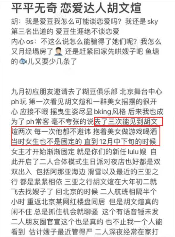 其实早在2021年便有站姐晒出了胡文煊深夜在夜店热舞的视频,一位夜店常客还发小作文爆料。称胡文煊三天两头混迹夜店,抱着美女做游戏喝酒,身边的女生也不固定。直到年底的时候才有了固定女友,新女友管得很严,胡文煊表面不敢造次,但一有机会就会撩骚。