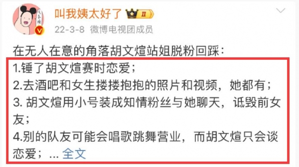 2022年3月,胡文煊站姐脱粉回踩,爆料4大讯息。除了锤胡文煊在比赛时恋爱、还拍到了胡文煊去酒吧和女生搂搂抱抱的视频。站姐还曝胡文煊人品不佳,会用小号诋毁前女友;业务能力也很差,别的队伍会唱歌跳舞营业,胡文煊只会谈恋爱。
