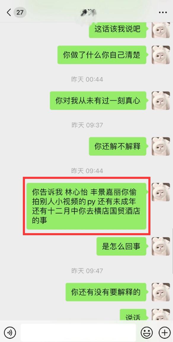 胡文煊女友的最后一条动态是凌晨3点发的,这次她晒出了自己和胡文煊的聊天记录,但都是她给胡文煊的留言,对方并未回应。留言中,胡文煊女友披露他和学舞蹈的未成年人发生关系,还有多次出轨记录。