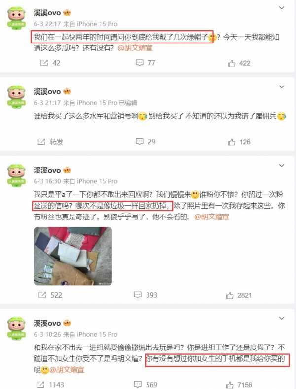 胡文煊女友从6月3日开始就连发多条视频控诉,哭诉和胡文煊在一起的两年时间里,他给自己戴了好几次绿帽子,并喊话胡文煊"孕期出轨,你这辈子都不配被原谅"。