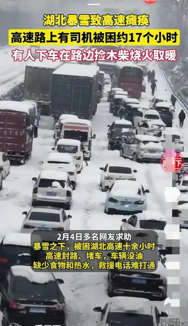 堵在雪中的车辆中,无论是燃油车、纯电车还是混动车,车主们都面临着各自的困境。一些人被困在路上数天,没有足够的食物和水。这一情况引起了当地村民的关注,许多人自发前往送水送食物,展现了灾难面前人性的温暖一面。