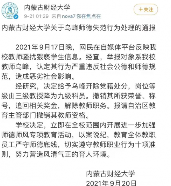 目前该教授已被开除党籍,撤销其名誉称号,追回奖金,解除教授职务。