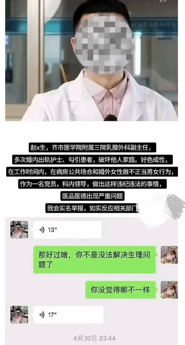 赵某生,齐齐哈尔医学院附属第三医院乳腺外科的副主任,被一名愤怒的网友李先生公开举报,称其与自己的女友有不正当关系。