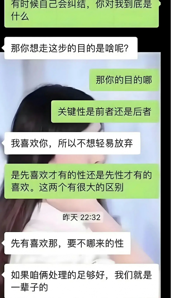 从后面的聊天记录来看,两个人应该是发生了矛盾。女子质问道:"你是先喜欢才有的性,还是有了性才有的喜欢,并表示这两者差距非常大"。而赵医生深知这就是一个送命题,表示自己是"先有的喜欢,才有的性"。同时还不忘告诉女子:"只要我们处理的足够好,我们就是一辈子"。