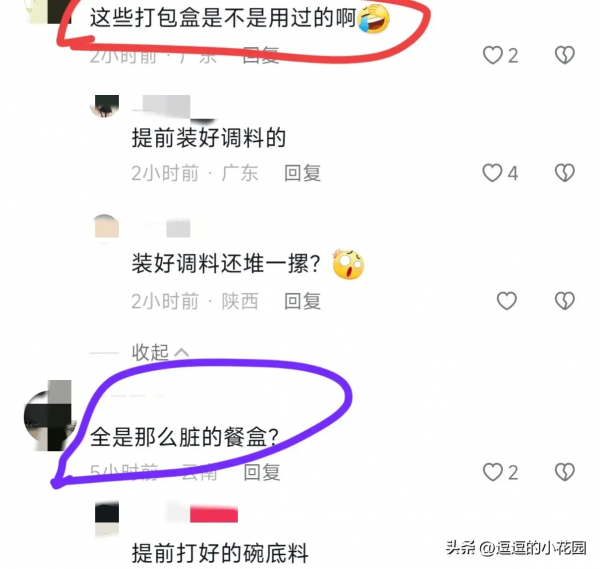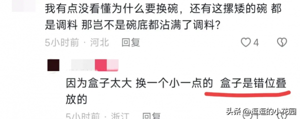 有懂行的网友表示:这是在每个餐盒底部都提前打好了调料,这样后续的步骤会快一些。看到不止一个人在质疑这个问题,商家也选择性的回复了几个网友:是调料在底部,不是脏的碗……