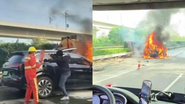 网传影像显示,日前,一辆问界M7于高速快车道上与一道路养护车辆发生追尾,问界M7车头起火,后整辆车被大火笼罩。