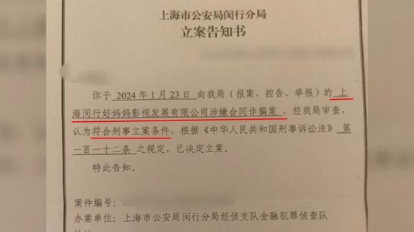 3月21日,上海市公安局闵行分局向王玲寄出《上海市公安局闵行分局立案告知书》,文件内容显示:你于2024年1月23日向我局(报案、控告、举报)的上海闵行好妈妈影视发展有限公司涉嫌合同诈骗案,经我局审查,认为符合刑事立案条件,根据《中华人民共和国刑事诉讼法》第一百一十二条之规定,已决定立案,特此告知。