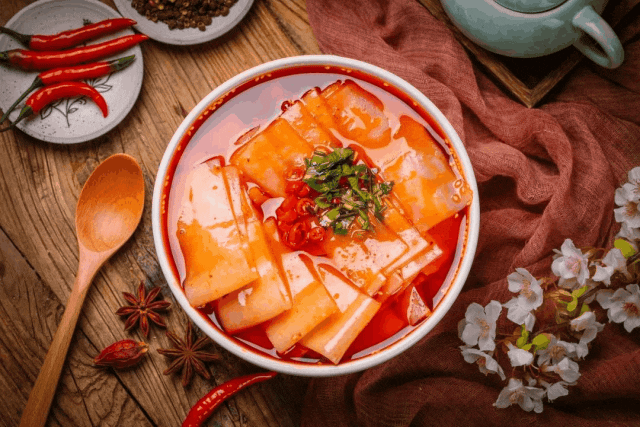 提到麻辣烫定西马铃薯和宽粉绝对是明星食材,定西被誉为"中国薯都",定西土豆淀粉含量高、黏性足,用土豆淀粉和面、切条现制而成的手擀粉晶莹透明 久煮也不会混汤,入口劲道十足,定西宽粉"滑劲透香爽"与灵魂汤汁和油辣子一同入口,简直是不可多得的神仙美味