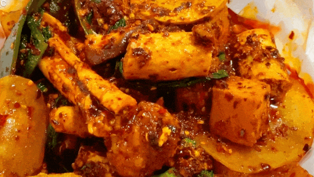 陇南麻辣烫里的"当家食材"都是陇南人的"心头好",陇南土豆、武都花椒、徽县的腐竹、油豆皮、豆干等豆制品、成县大蒜、西和宽粉、康县木耳、成县小川陈醋结合,红通通的辣汤红油闪着光,一口下去那叫一个"地道"