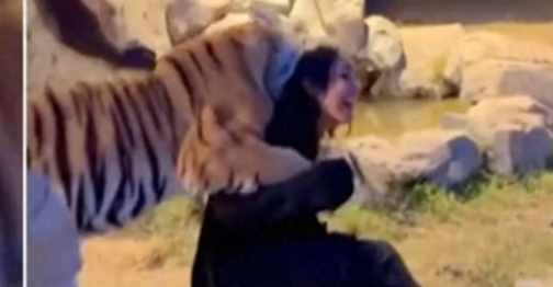 女子看得入迷,不禁产生了与老虎亲密接触的念头。在饲养员的陪同下,女子坐在地上温柔的抚摸着一只老虎,就在这时候另一只老虎从女子后背处扑咬过去,另一只老虎见状也扑到女子身上,就在这时一名饲养员及时拉住了老虎!