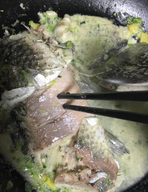 但是今天的这条鱼,下锅几分钟后渐渐觉得有点不对劲。没有鱼肉香,而且看着还是硬硬的,再煮多几分钟,鱼肉还没有如平常那样裂开。拿筷子戳,居然是硬梆梆的。继续煮,筷子戳着只留下印记,鱼肉还是没煮开。正常鱼肉很快会煮得软软烂烂的,尤其鱼肚子上的肉,拿筷子轻轻一拨就能沿着大鱼刺带下来。