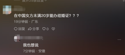 有网友直接提出质疑:在中国女方未满20岁能办结婚证???