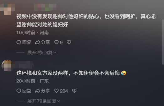 也有网友评论:没有发现谢帅对他媳妇的贴心,也没看到呵护,真心希望谢帅能对她的媳妇好
