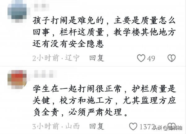 "学生在一起打闹很正常,护栏质量是关键,校方和施工方,尤其是监督方应负全责,必须严肃处理。"