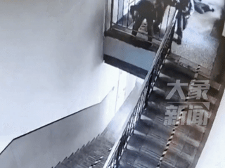 和他一起玩耍的男孩,看到他坠落楼梯,也是非常慌张,连忙下楼梯查看。