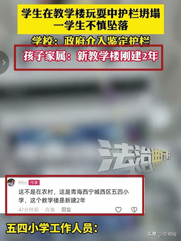 近日,青海西宁五四小学三名学生课间玩耍打闹时,一男孩被推搡撞到楼梯护栏,之后护栏被撞破,男孩跌落到楼下。