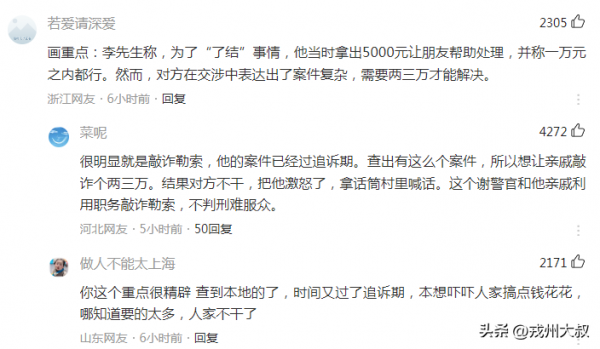 有网友说:很明显就是敲诈勒索,他的案件已经过追诉期。查出有这么个案件,所以想让亲戚敲诈个两三万,结果对方不干,把他激怒了,拿话筒村里喊话。这个谢警官和他亲戚利用职务敲诈勒索,不判刑难服众。