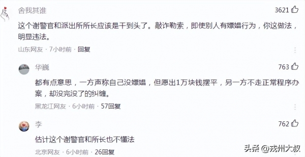 有网友说:这个谢警官和派出所所长应该是干到头了,敲诈勒索,即使别人有嫖娼行为,你这做法,明显违法。