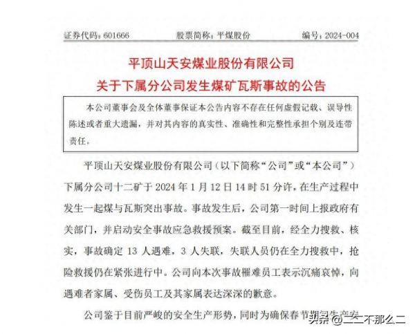 2024年1月12日的河南平顶山市,一场突如其来的煤与瓦斯突出事故在平煤股份旗下的天安煤业十二矿爆发。13人遇难,3人失联,这不仅是一场矿难,更是对煤矿安全体系的深刻拷问。