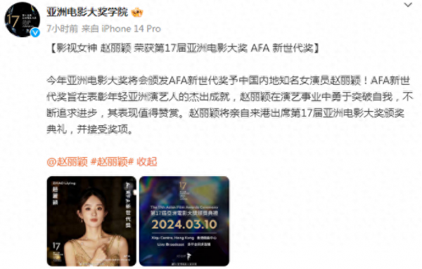 亚洲电影大奖官方微博消息原文:"今年亚洲电影大奖将会颁发AFA新世代奖予中国内地知名女演员赵丽颖!AFA新世代奖旨在表彰年轻亚洲演艺人的杰出成就,赵丽颖在演艺事业中勇于突破自我,不断追求进步,其表现值得赞赏。赵丽颖将亲自来港出席第17届亚洲电影大奖颁奖典礼,并接受奖项。"