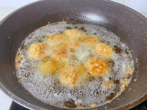 4、锅中倒入多一些的食用油,油温烧至插入筷子冒小泡,把团好的丸子顺着锅边滑入锅内,丸子炸定型后用木铲朝一个方向滑动一下,小火慢慢炸,把丸子炸透、炸至表面金黄,大概小火炸20分钟左右,捞出控油。炸的作用是让丸子颜色好看、口感好。