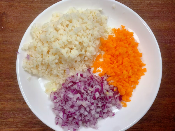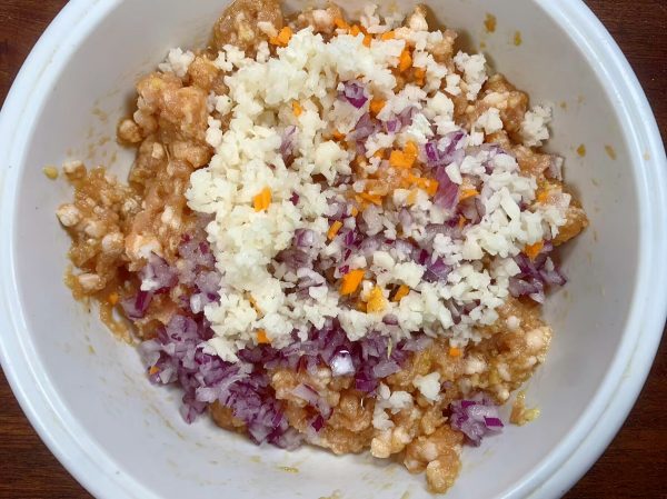 具体做法:1、首先准备一些配菜,取一块莲藕清洗干净,削掉外皮剁碎,放一些莲藕可以丰富口感,吃起来咯吱咯吱的,有嚼劲。接下来再准备一个胡萝卜和一个洋葱都处理干净后剁碎,所有配菜装盘备用。