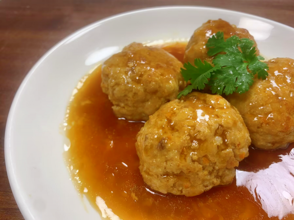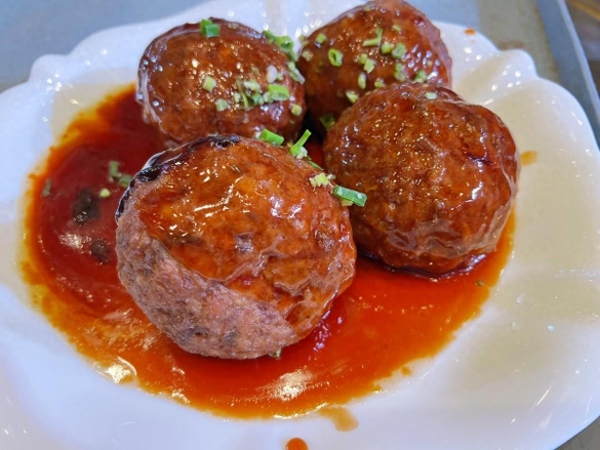 6、用水淀粉加味极鲜勾芡一个汤汁,浇在蒸熟的四喜丸子上,这样色泽立马就鲜亮了,看着特别有食欲,入口软糯,香而不腻,鲜嫩入味,简直是太香了。