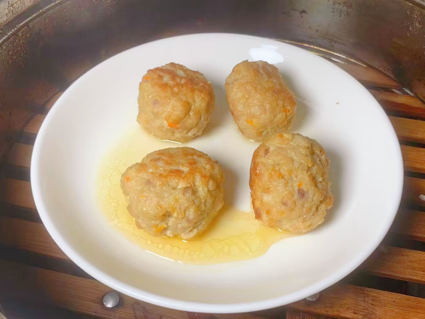 5、接下来把炸好的丸子放入锅内,大火烧开后蒸30分钟,把肉丸子蒸熟。