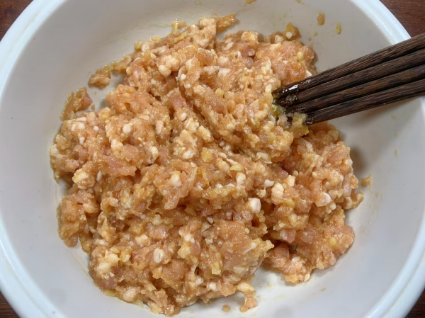 3、再放入1小勺玉米淀粉、1大勺食用油拌均匀后不停地摔打肉馅,让肉馅更紧实一些,这样丸子炸出来不散,并且筋道好吃。取适量肉馅攥紧实后揉成丸子,一个个团好。