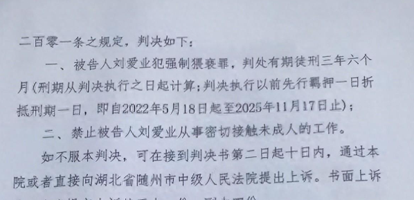 2022年12月时,随县法院判决,被告人刘爱业犯强制猥亵罪,判处有期徒刑三年六个月。
