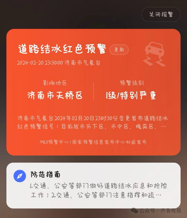 昨天深夜,不少网友发截图表示,济南市发布道路结冰红色预警。