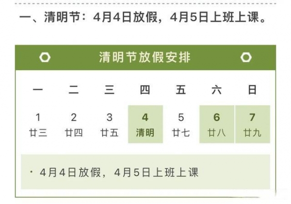 3月28日,华中农业大学发布公告称,结合校历和年度教学计划安排,学校制定了全年部分节假日放假安排,学校全年周末正常休假,不做调课安排。