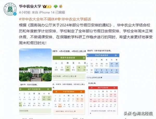 对此,经视直播记者联系上了华中农业大学教务处,工作人员回应称,公告内容属实。做这样的安排,一方面是为了保障教学安排,"如果周末调休,有一些课程可能就会被冲掉了。"另一方面,也是为了让学生劳逸结合。按照国家关于2024年部分节假日安排,存在连续7天或者6天上班上学的情况,"我们也是想避免这样的情况。"