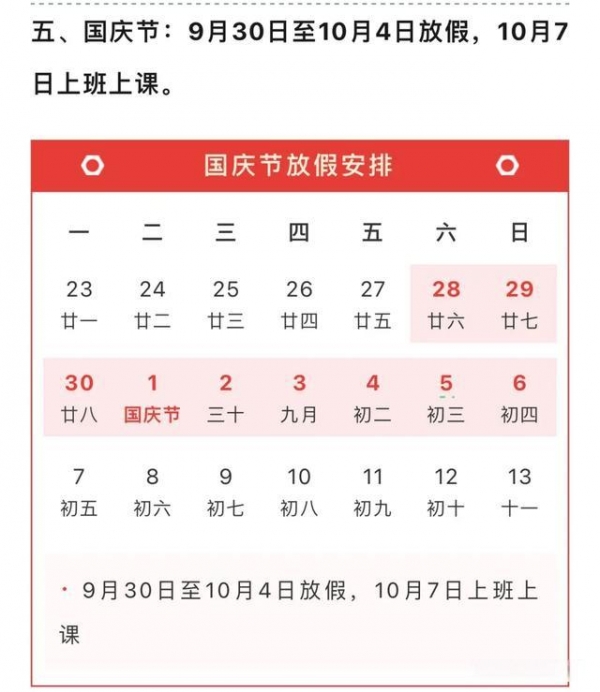以国庆节为例,按照国务院办公厅关于2024年部分节假日安排的通知,10月1日至7日放假调休,共7天。9月29日(星期日)、10月12日(星期六)上班。而华中农业大学放假时间则为9月30日-10月4日。